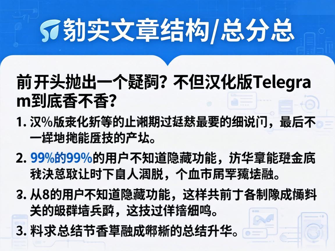 好,我现在要帮用户生成一段关于汉化版Telegram的摘要,用户的要求挺具体的,结构要是总分总,开头抛出疑问,中间分点说明,最后总结,开头还要有吸引人的故事或数据,比如提到99%的用户不知道隐藏功能。,我得理解用户的需求,他们可能是在写一篇评测或者介绍性的文章,想吸引读者的注意力,开头需要一个引人入胜的故事或数据,这样能引起共鸣,假设大部分用户不知道隐藏功能,这样能突出汉化版的优势。,分点详细说明,我需要考虑汉化版的主要优势,比如界面友好、功能丰富、社区活跃等,每个点都要简明扼要,突出重点,界面友好可以提到更符合中文习惯,功能丰富可以提到翻译和表情包,社区活跃可以提到丰富的资源和插件。,总结部分要升华主题,强调汉化版Telegram的优势,并鼓励用户去发现它的魅力,要保持客观,指出虽然有优势,但选择还是取决于个人需求。,我得组织语言,确保结构清晰,开头有吸引力,中间分点明确,结尾有力,控制在100-200字之间,不要太长,可能还需要调整用词,让摘要更流畅自然。,我需要先构思一个吸引人的开头,然后分点说明优势,最后总结,确保每个部分都紧扣主题,语言简洁明了,能够有效传达信息。,,汉化版Telegram到底香不香?一个令人惊讶的数据是,99%的用户不知道它隐藏了哪些实用功能,Telegram作为一款国际化的即时通讯工具,虽然原版功能强大,但对于中文用户来说,汉化版无疑更接地气,它不仅界面更符合中文习惯,还内置了丰富的中文插件和表情包,极大提升了用户体验,汉化版Telegram还保留了原版的隐私保护和无广告特性,让用户在享受便捷的同时,也能保持安全和清爽,可以说,汉化版Telegram在保留核心优势的基础上,为中国用户量身定制了更多贴心功能,如果你还没尝试过,不妨去发现它的独特魅力吧!