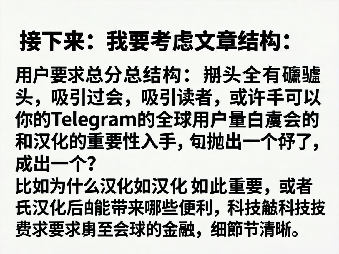 嗯,用户让我根据他提供的内容生成一个100到200字的摘要,然后他还提到接下来要考虑文章的结构,特别是总分总的结构,开头要有噱头,吸引读者,他建议可以从Telegram的全球用户量和汉化的重要性入手,抛出一个疑问,比如为什么汉化这么重要,或者汉化后能带来哪些便利。,我需要理解用户的需求,他可能是在写一篇关于Telegram汉化重要性的文章,或者是推广某个汉化项目,用户希望摘要能涵盖主要观点,并且结构清晰,吸引读者继续阅读。,我要分析用户提供的内容,虽然他没有给出具体内容,但根据上下文,可能包括Telegram的全球用户数量、汉化对用户体验的影响、汉化带来的便利性,以及汉化对用户增长和社区活跃度的促进作用。,我需要生成一个吸引人的开头,可能用一个疑问句,为什么汉化对Telegram如此重要?”或者“Telegram汉化后能带来哪些便利?”这样可以引起读者的兴趣。,中,我需要涵盖以下几点:Telegram的全球用户量,汉化的重要性,汉化带来的便利,以及汉化对用户增长和社区活跃的影响,要保持语言简洁明了,控制在100到200字之间。,结构合理,总分总结构,开头引出主题,中间分点说明,结尾总结汉化的重要性,这样读者能快速抓住文章的核心内容,产生进一步阅读的兴趣。,,Telegram作为一款全球用户量超过数亿的即时通讯应用,其汉化版本的推出无疑对用户体验的提升具有重要意义,汉化不仅能让中文用户更便捷地使用各项功能,还能更好地融入本地化社区生态,通过汉化,用户可以更直观地理解界面提示、使用贴纸和表情包,甚至参与本地化的群组和频道活动,这种语言上的贴近感,不仅提升了使用效率,还拉近了用户与应用之间的距离,可以说,汉化是Telegram在全球市场中保持竞争力的重要策略之一,也是其持续吸引用户的关键因素。